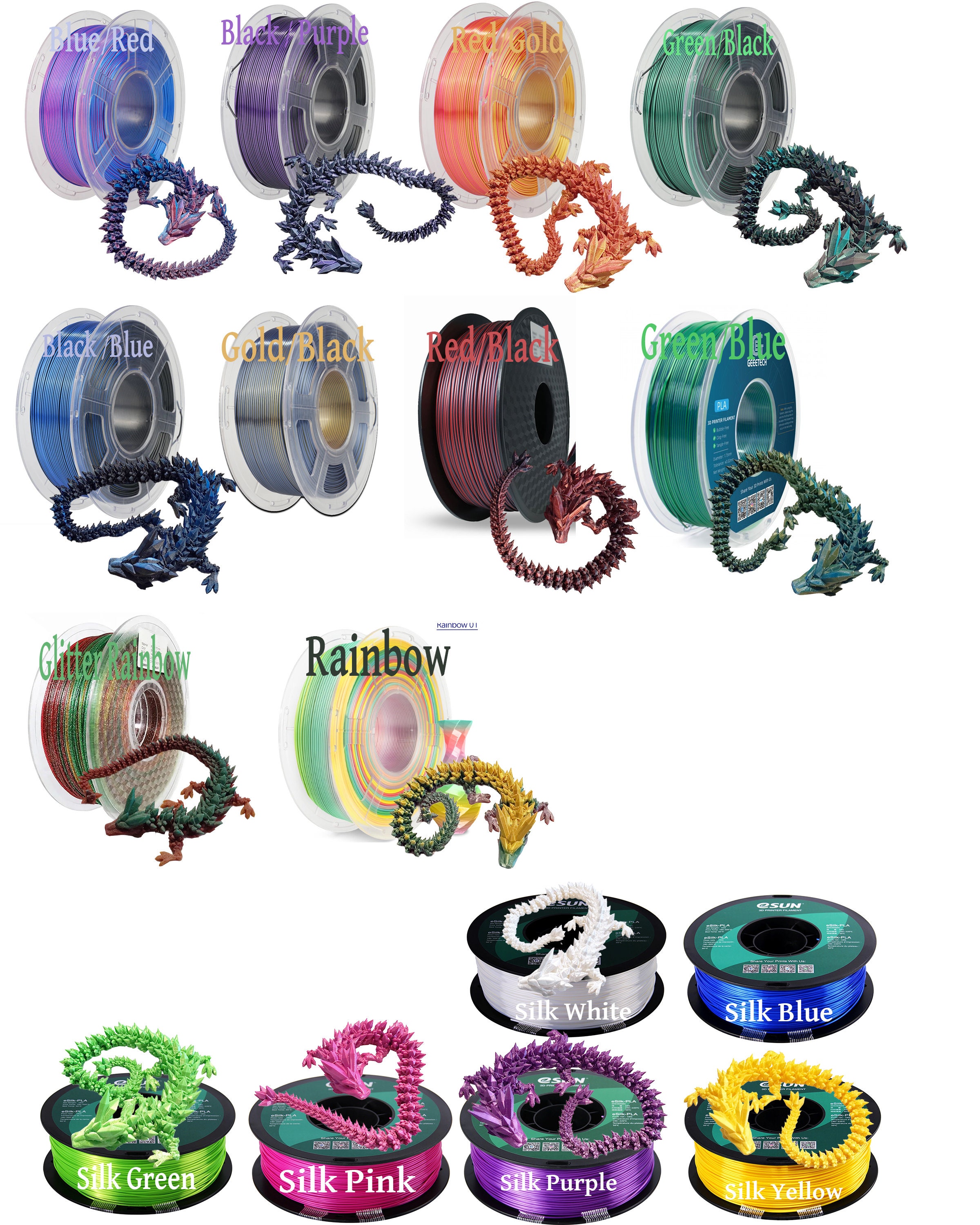 A gorgeous dark heart dragon. these are printed in a base of either black or white and can have any colour of our filament range as the hearts and main dragon can be printed in separate colours. Base colour is black white. Secondary colour is our range of colours Single colour base will be whatever you choose as the secondary. so it'll be a complete solid 1 coloured dragon Can do special requests like a base being a different colour but would have to be a personalised request. Here is our take on Cinderwing3d's dark heart Model Dark Heart Dragon is 46cm in Length Made from PLA and 3D printed with care. All our Dragons are Printed at 0.16mm layer height and are printed with the utmost care. Please note due to the nature of 3D printing some layer lines can be seen and there may be slight defects. This is normal for 3D printing but we do our best to provide stunning prints and all prints are printed with strength in mind. ** We have Limited Colours but are always expanding so keep an eye out ** Note as our products are made to order there may be a slight wait. These guys take 32 hrs for a double colour or 20 hrs for a single :)