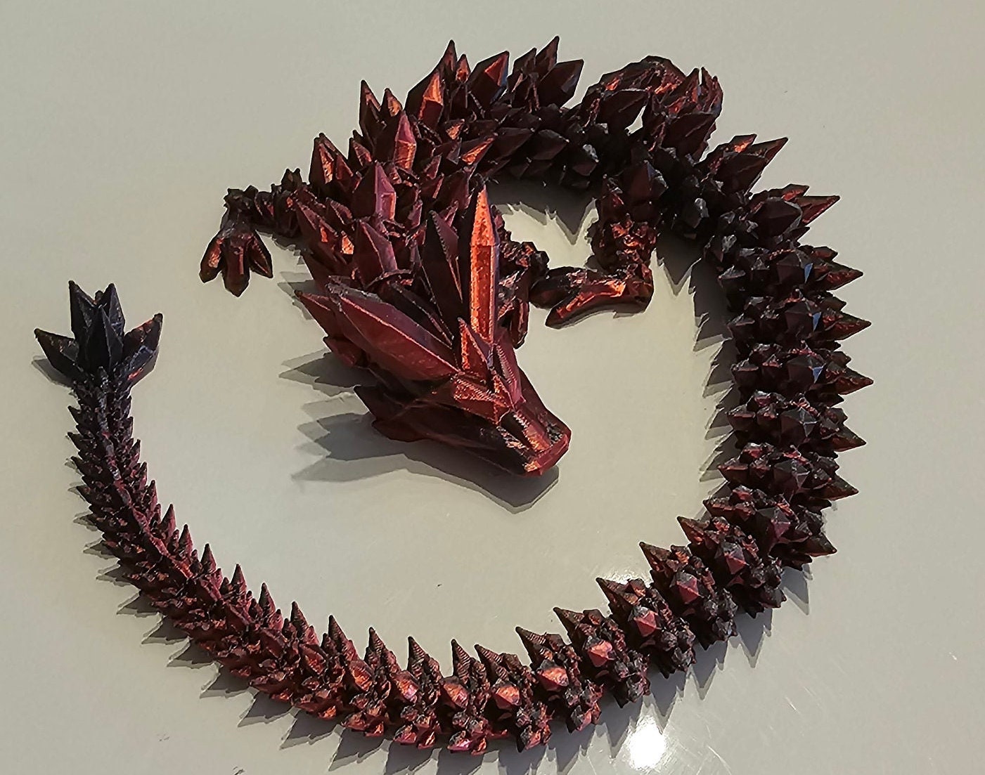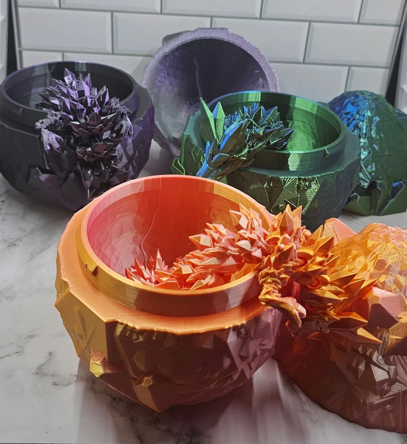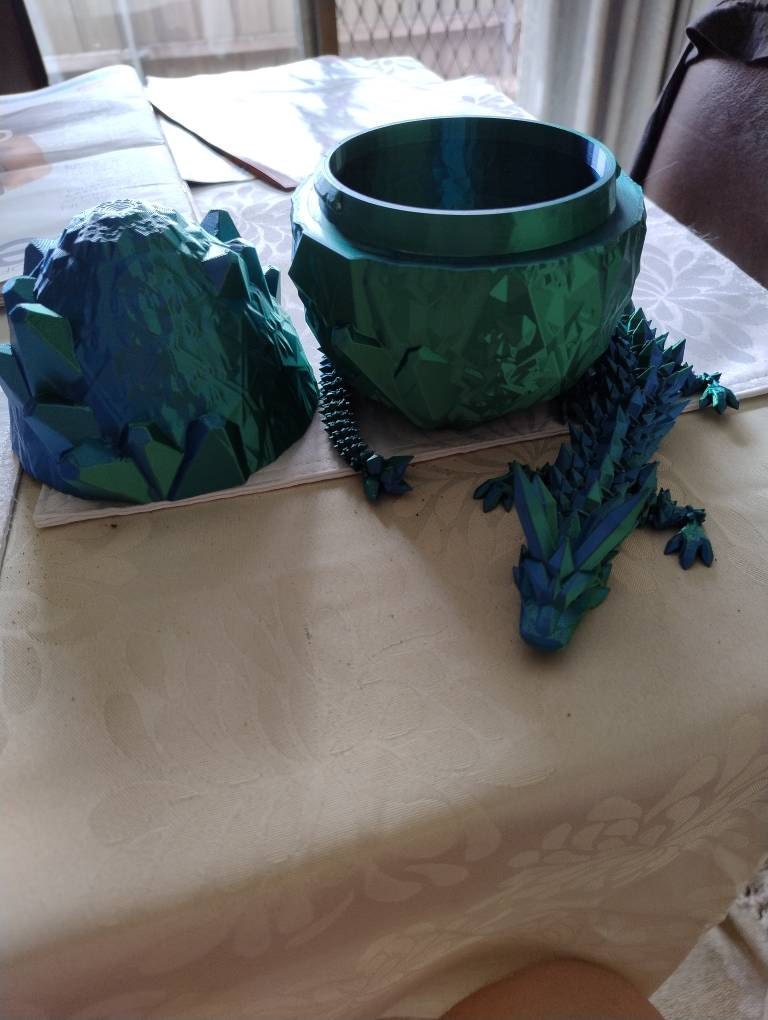 A really cool egg container that comes with a 42cm long crystal dragon. Here is our take on Cinderwing3d's Model this size is 42cm and is a great print. crystal egg height is 16cm is quite large and fits the dragon nicely. Note with Rainbow filament the colours may shift slightly due to the nature of how the rainbow filament is wound. each dragon will be slightly unique in colour and we think thats a cool thing :D No 2 rainbows will be the same Made from PLA and 3D printed with care. All our Dragons are Printed at 0.16mm layer height and are printed with the utmost care. Please note due to the nature of 3D printing some layer lines can be seen and there may be slight defects. This is normal for 3D printing but we do our best to provide stunning prints and all prints are printed with strength in mind. Happy to print these in a colour that'll suit. Depending on what I have available. Just send me a message and will get your order sorted today :) ** We have Limited Colours but are always expanding so keep an eye out ** Note as our products are made to order there may be a slight wait whilst our machines print your order.
