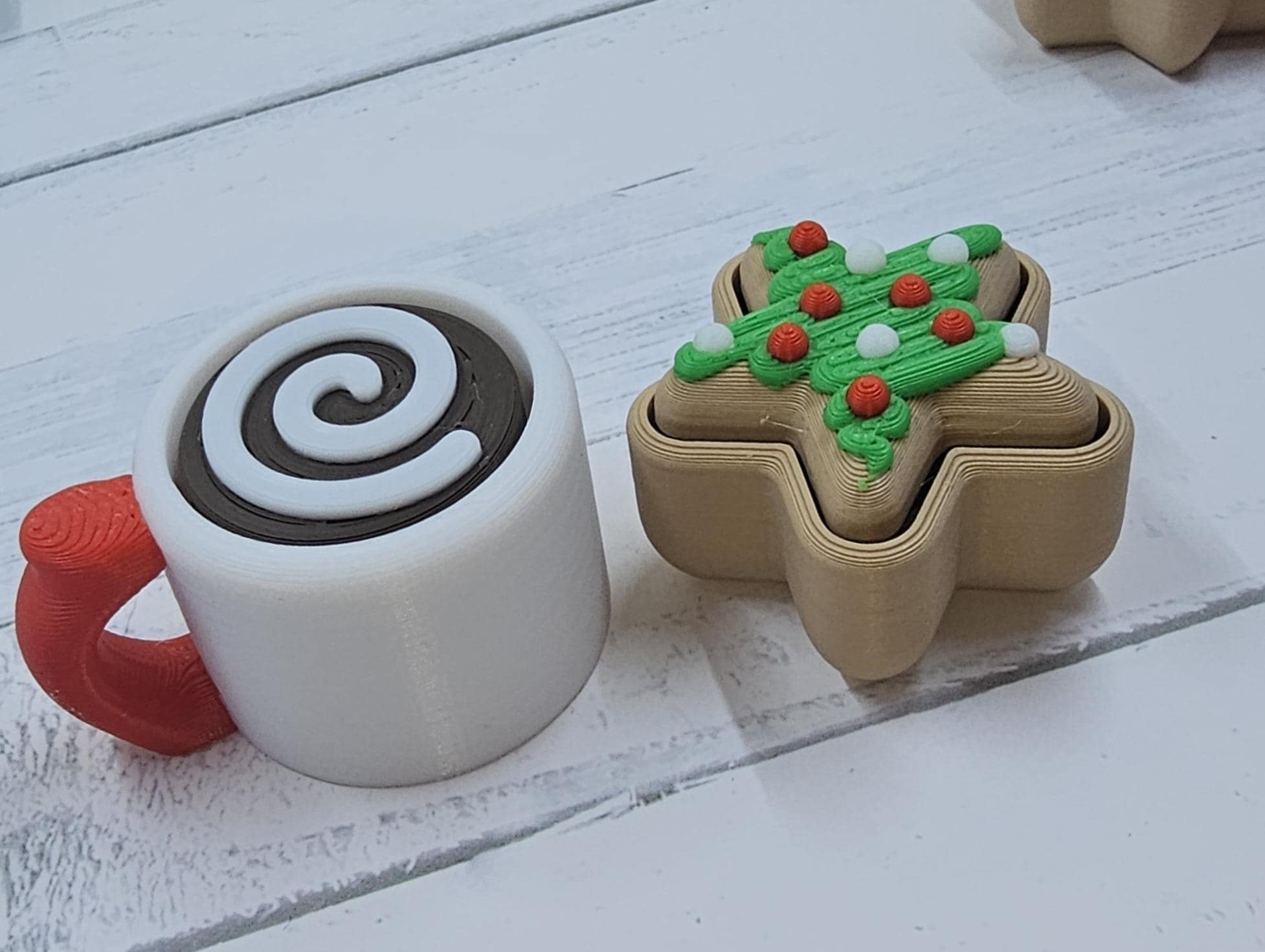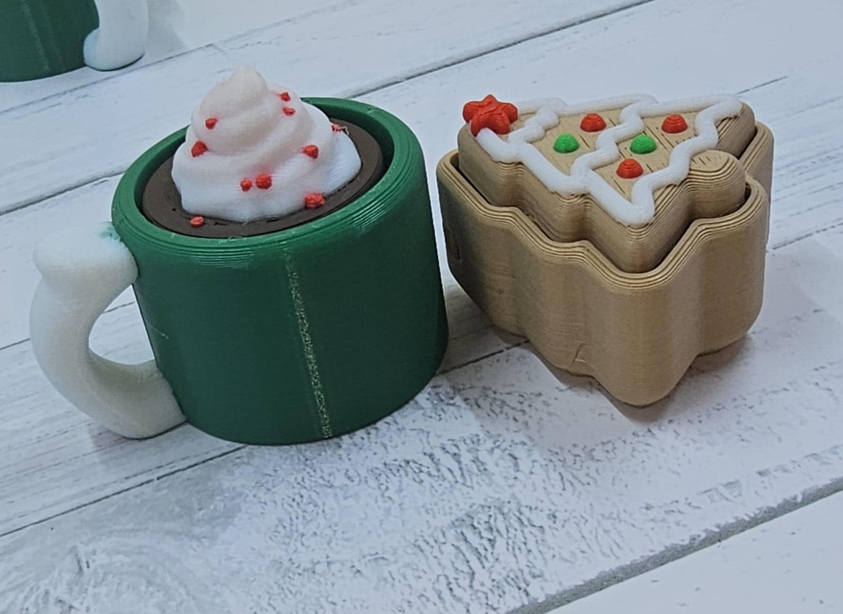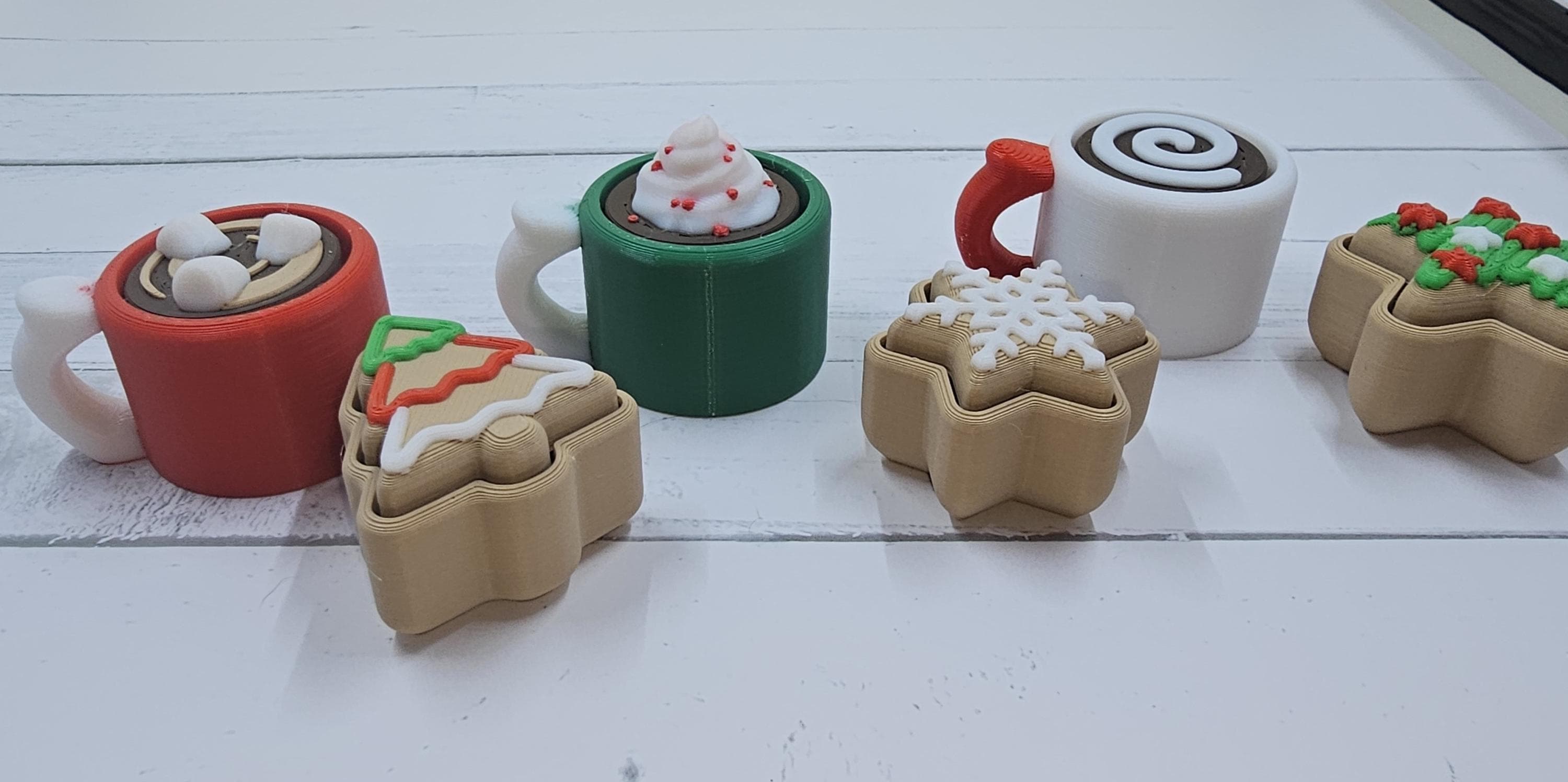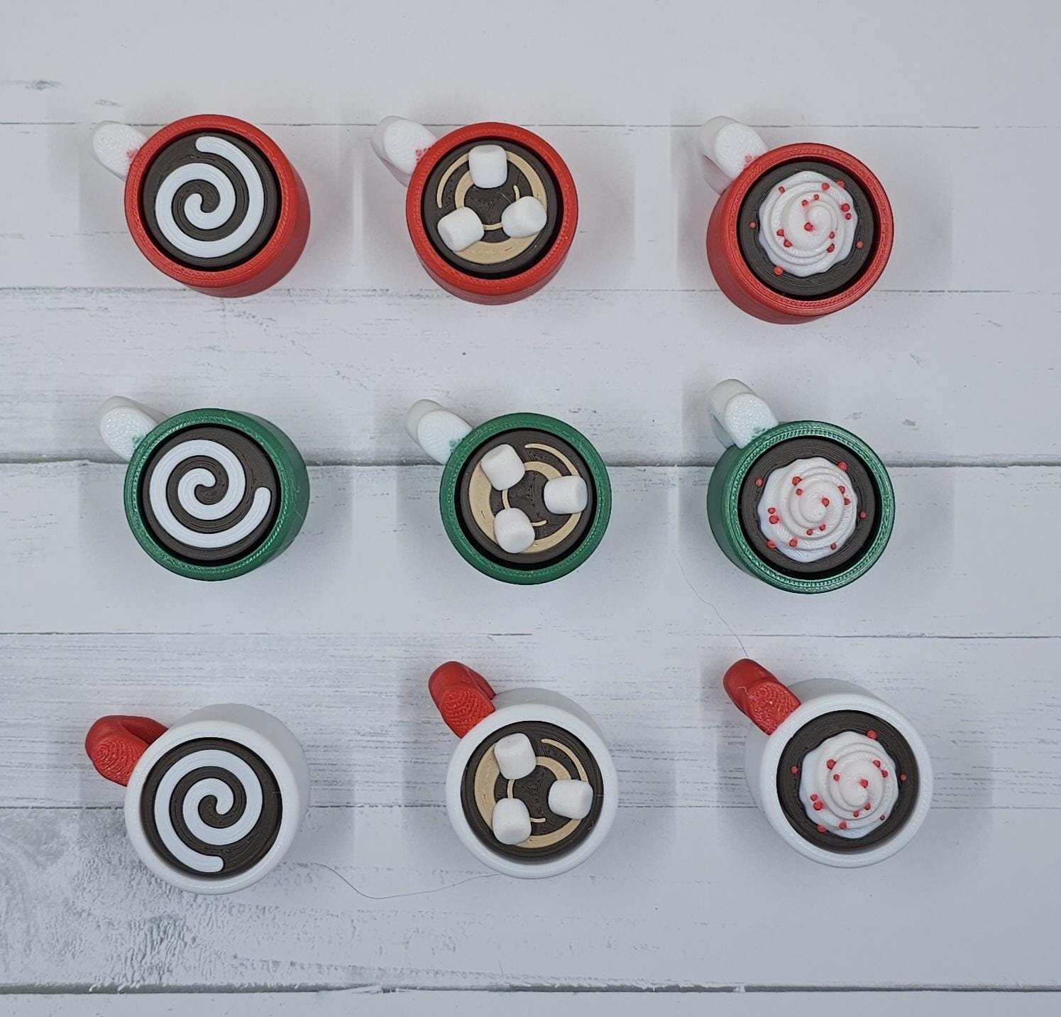 ✨ The Ultimate Holiday Fidget Duo – Best Value Gift! 🎁 Christmas Duo Pack Includes: A Hot Cocoa Mug Clicker and a Sugar Cookie Clicker, giving you two premium fidget keychains for only $9.00! Perfect as a stocking stuffer, desk accessory, or a festive little treat for anyone who loves clickers. 🧠 Key Features – Quality & Craftsmanship Premium Click: Both the Mug and Cookie feature a genuine mechanical key switch for a durable, high-quality tactile click. High Detail Finish: Each is printed in 4–5 separate filaments for maximum realism — think rich chocolate tones, creamy swirls, and candy sprinkles! Work & Gift Friendly: A discrete desk fidget or adorable keychain companion. Available Themes: Choose your favourite holiday combo: 🎅 Classic Red/White (Red Mug) 🌲 Forest Green/White (Green Mug) ❄️ Snowy White/Red (White Mug) 📏 Dimensions (Approximate) Hot Cocoa Mug Clicker Length (incl. handle): 45.5 mm Width (mug body): 33.5 mm Height range: 24.0–36.3 mm (varies by topping) Cocoa Topping Heights: Swirl (Plain): ~24 mm Marshmallows: ~29 mm Foam w/ Red Dots: ~36 mm Christmas Cookie Clicker Height: 23–26 mm (varies by shape/icing) Width: 35–37 mm (e.g. Tree, Star) 🍪 Assortment Policy To ensure fast holiday shipping, the cookie shape (Tree, Star, etc.) and cocoa topping (Swirl, Marshmallow, etc.) are chosen at random. If you’d like a particular combination, please leave a Note to Seller at checkout — we’ll do our very best to accommodate based on stock. ✅ Ready to Ship Fast for Christmas! Beautifully made, fun to click, and bursting with festive charm — this duo is the perfect way to spread a little joy this season.