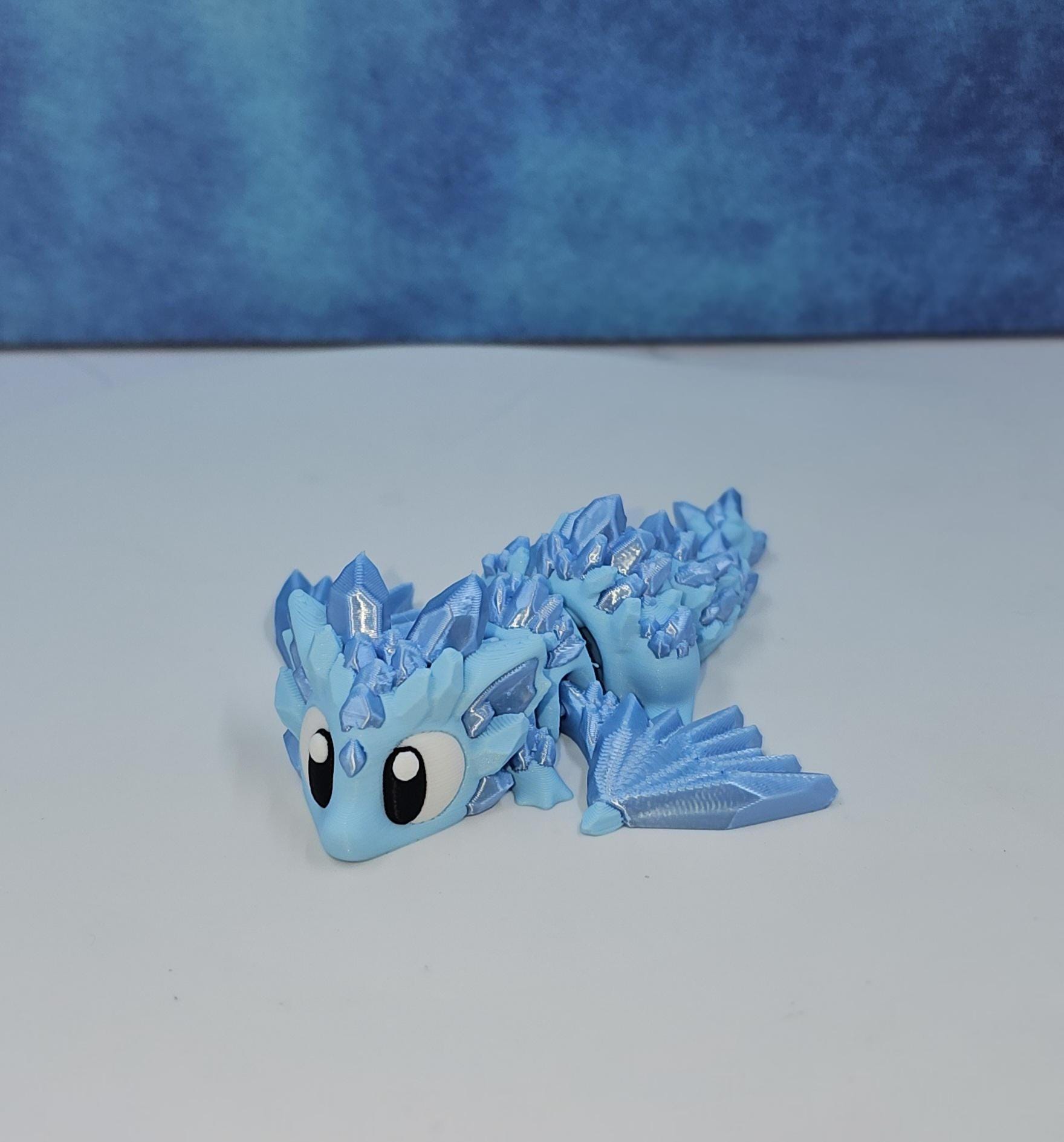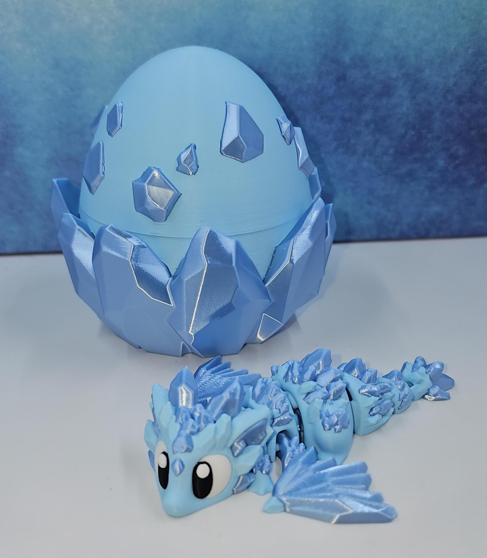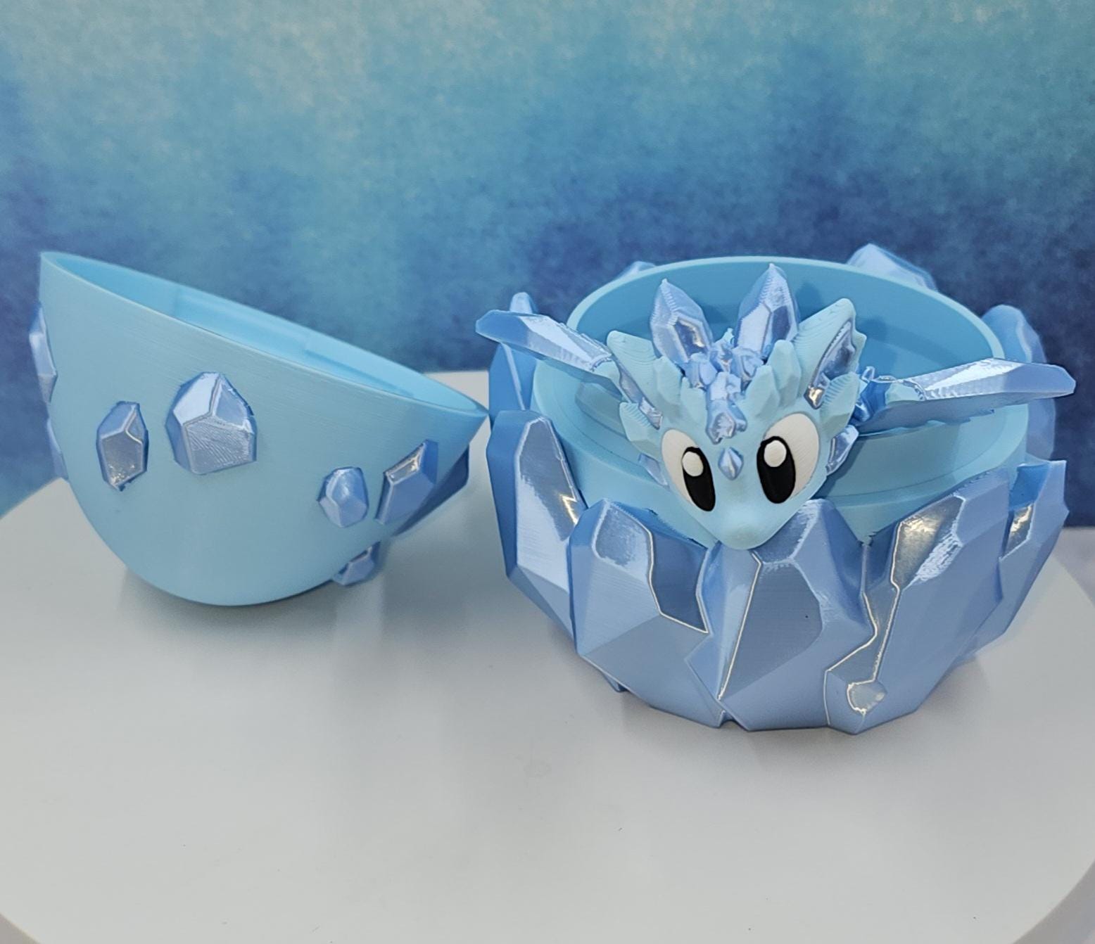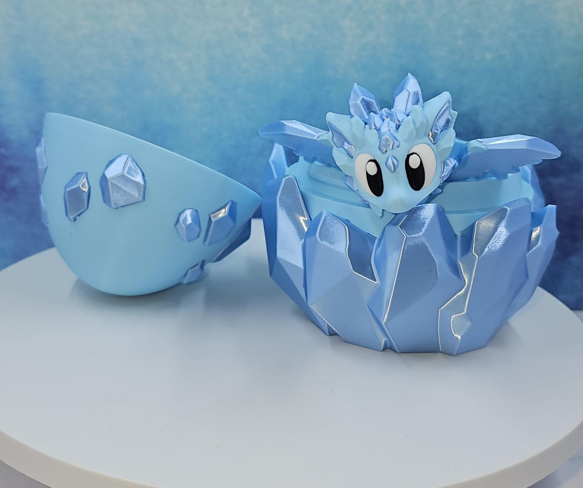 This set features a charming mini crystal dragon paired with a matching crystal-style egg. Printed in a stunning combination of matte ice blue and silk sky blue, the crystal accents catch the light beautifully and give this piece its signature shimmer.