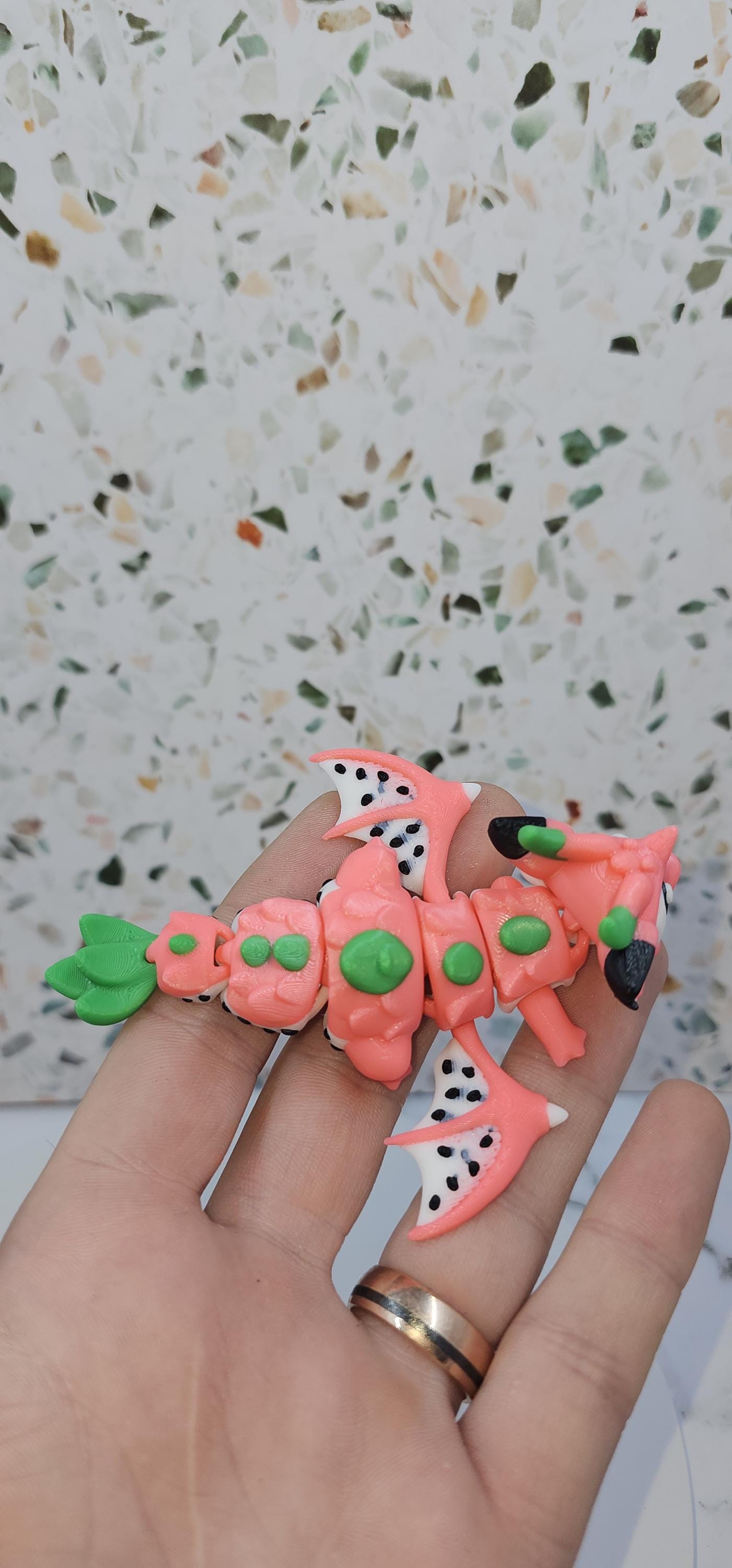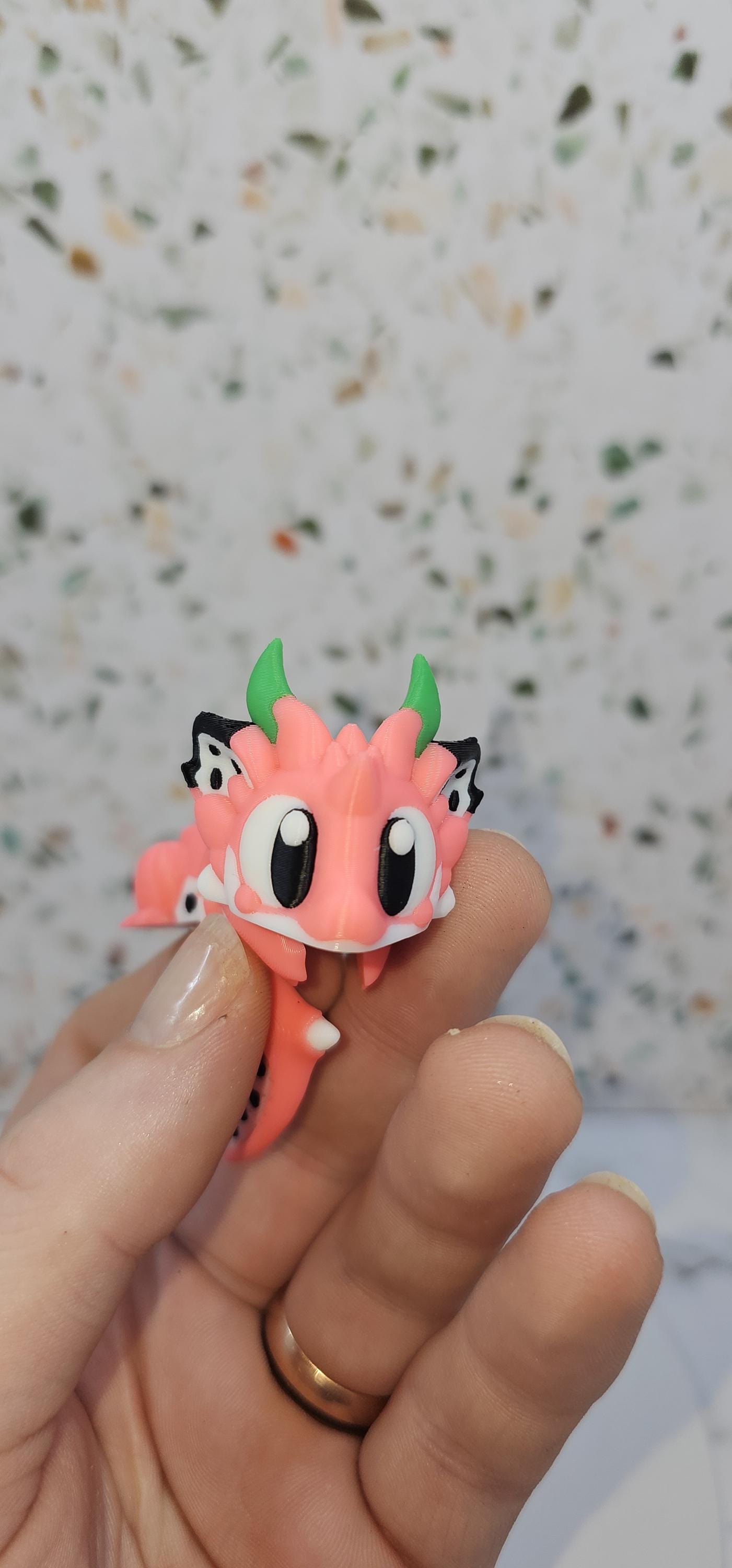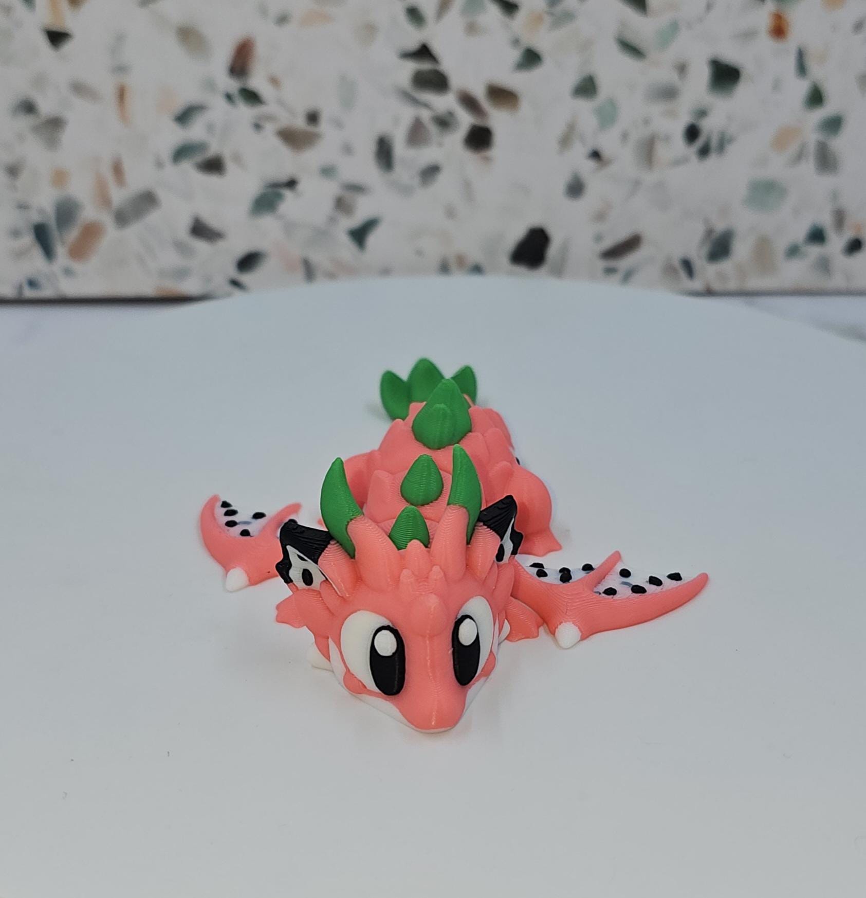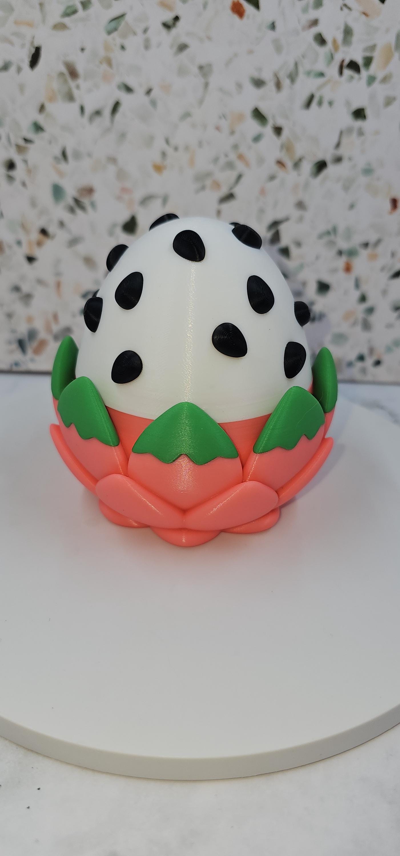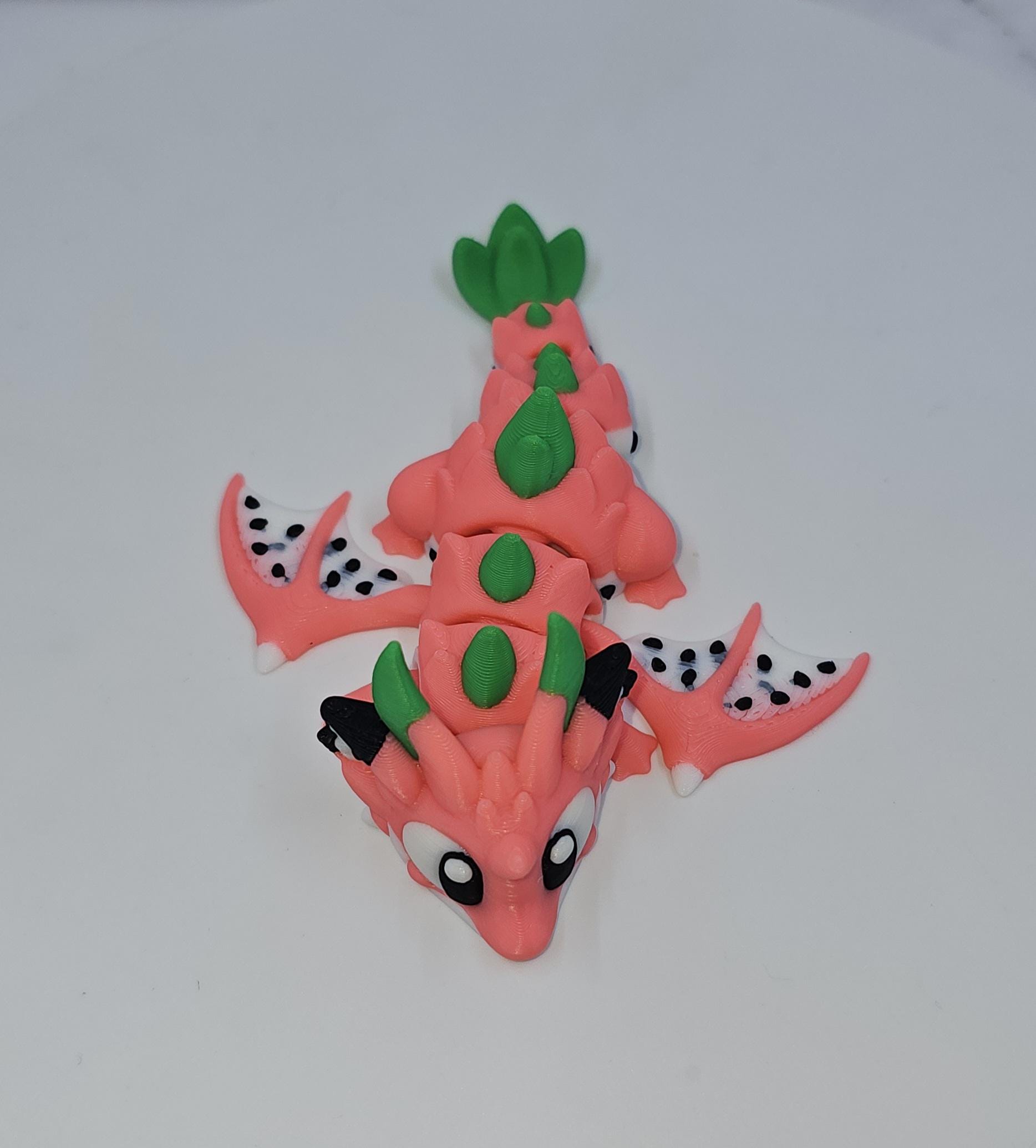 Inspired by vibrant dragon fruit colours, this playful mini dragon features bright pink tones, leafy green accents, and seed-like details. It pairs perfectly with its matching dragon fruit–style egg, designed to hold and display the dragon when not in use.