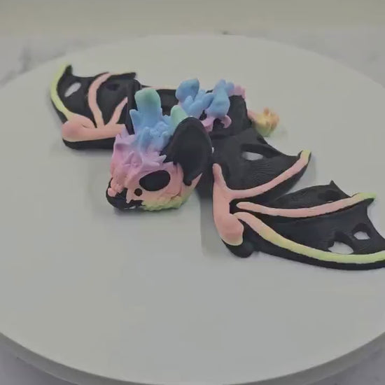 Adorable articulated bat in pastel rainbow and black. Flexi fidget-style toy perfect for Halloween, spooky gifts or gothic decor!