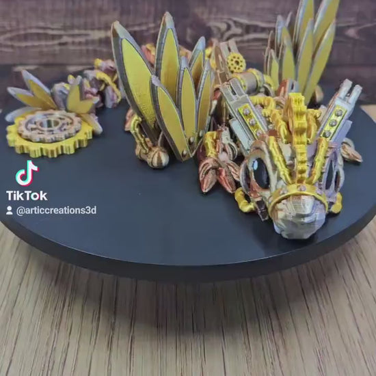 These articulated baby steampunk dragons are full of clockwork magic! Printed in a shimmering tri-color filament (bronze, silver & gold) with metallic gold accents, each dragon has a unique steampunk style and a tail Cog that actually spins.